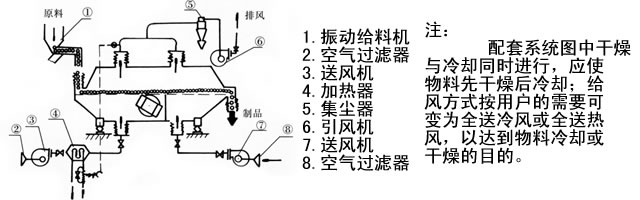 The product is new drying equipment vibration fluidized principles of design, with high efficiency, excellent performance characteristics, suitable for chemical, pharmaceutical, light and food, seeds, beverages, slag, alcohol, matches, fertilizer and other industries powder, dry granular material, cooling and other operations.